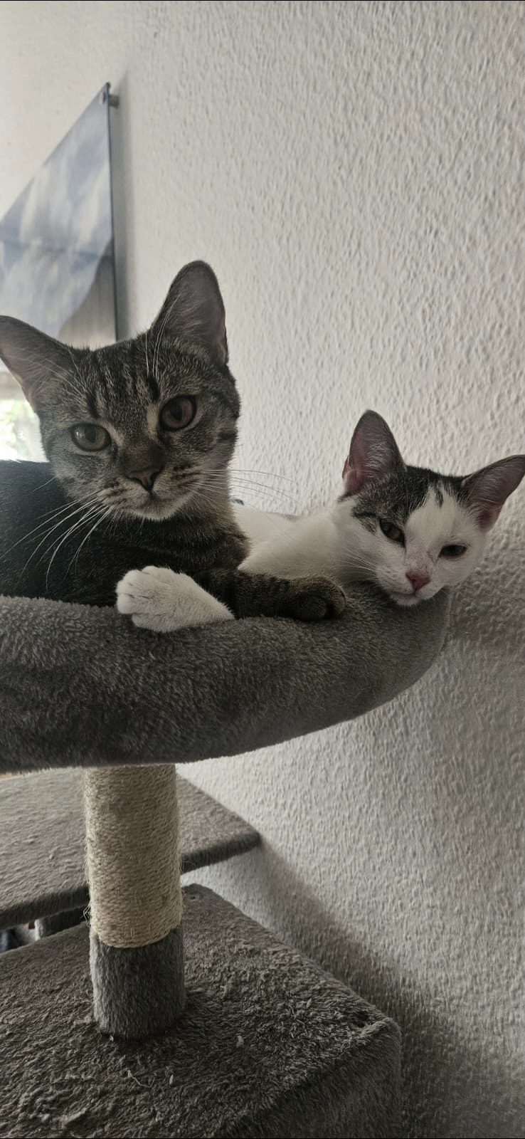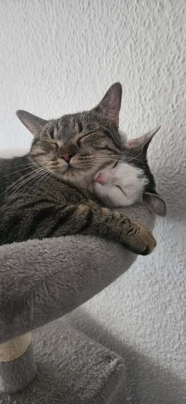 Beide sind 2 Jahre alt und zeigen uns jeden Tag auf ihre ganz eigene Art, wie individuell Katzen in ihrem Wesen sind – und wie wichtig Verständnis, Geduld und Vertrauen in der Betreuung sind.